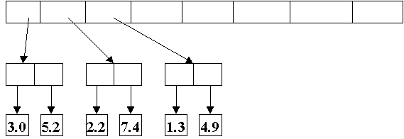 Complex lower level languages such as C++ (and a certain subset of Java) give the programmer more direct control over the physical implementation of each data value. This allows fine grained control of the precise semantics of each individual field and variable. Each field or variable can be declared either as a pointer or as inline, declarations which can be mixed arbitrarily within compound data types. Additionally, memory can be allocated either on the stack or on the heap, with different memory management protocols. This leads to many complications for the programmer, who has to keep track of the different semantics of each value, and the different memory management issues involved with stack and heap-allocated data structures. This often leads to many common memory usage errors. This complicated data model has clear drawbacks in terms of simplicity and uniformity, but can often provide significant efficiency improvements over the high-level data model, often up to an order of magnitude in numerically intensive applications [3]. For instance, the same array of complex numbers described above can now be represented completely inline (figure 3).