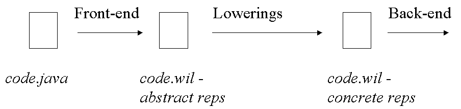 Initially a language specific front-end will compile the source program into a WIL textual file. Each variable, method parameter and return value will be annotated with an abstract representation as specified in the WIL syntax. This representation determines the operations possible on the given value, as well as the value's semantics for equality, assignment and allocation.