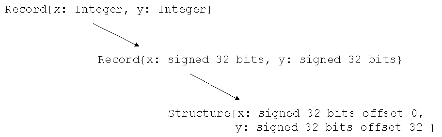 The first step in this sequence of lowerings chooses physical representations for each field in the record, choosing to represent both integers as signed 32 bit values. The ordering of the fields and their offsets remains unspecified. The next step lowers the Record to a Structure, specifying the order of the fields, as well as their offsets. This specification is now fully concrete, as it determines a concrete physical implementation for the value and all associated operations. The compiler back end can now generate code appropriate for the chosen physical representation.